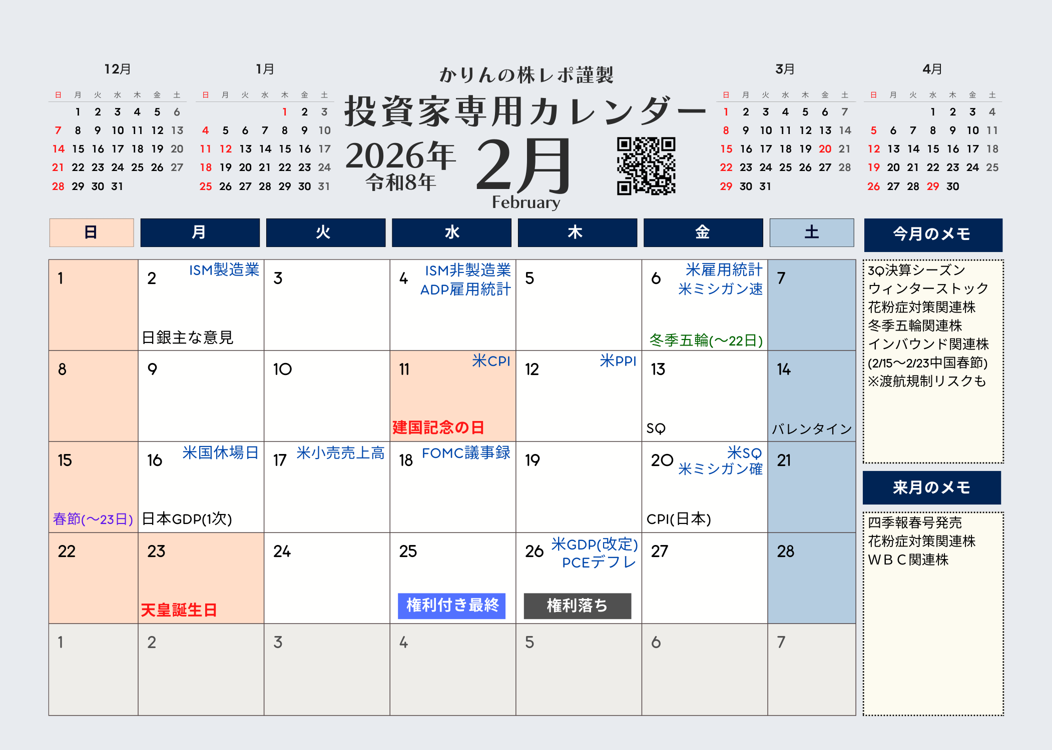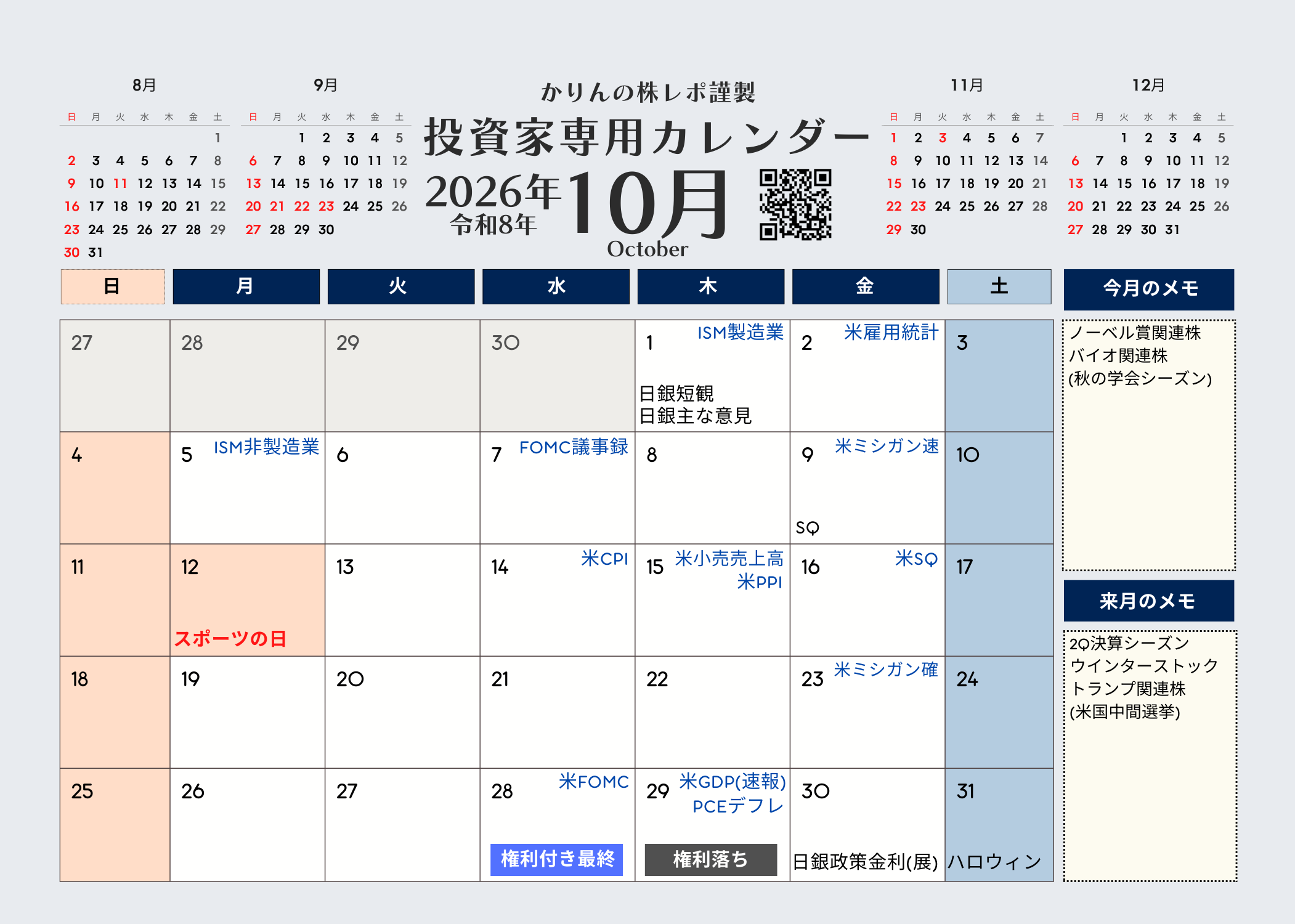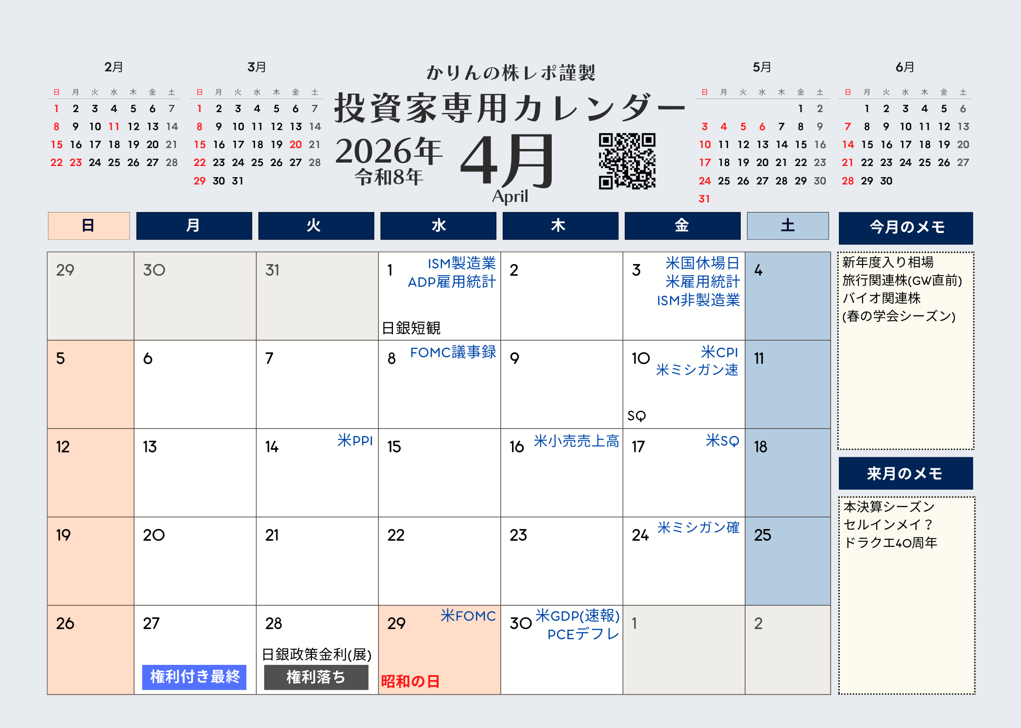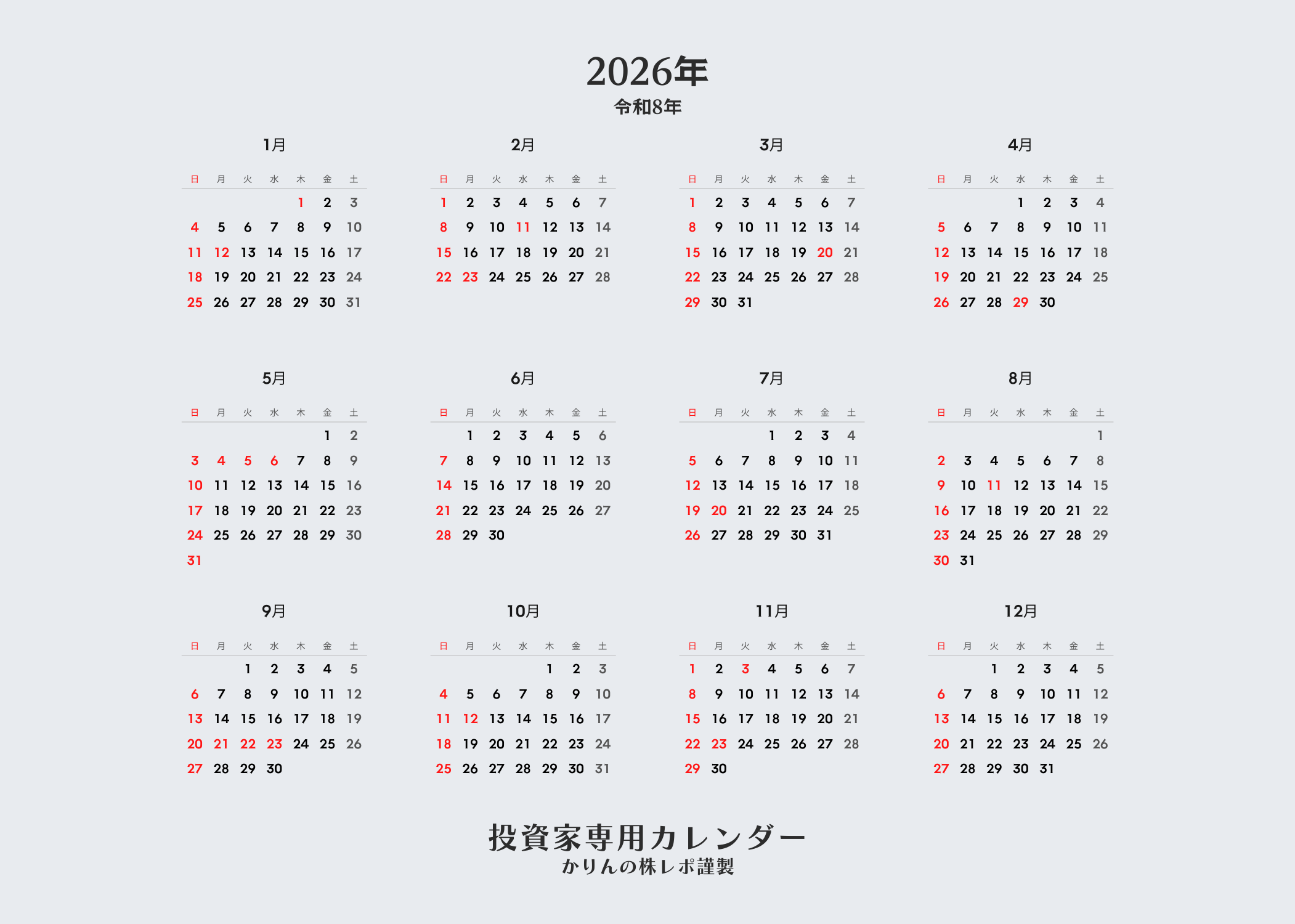 かりんの株レポ謹製 投資家専用カレンダー2026年版版(令和8年)