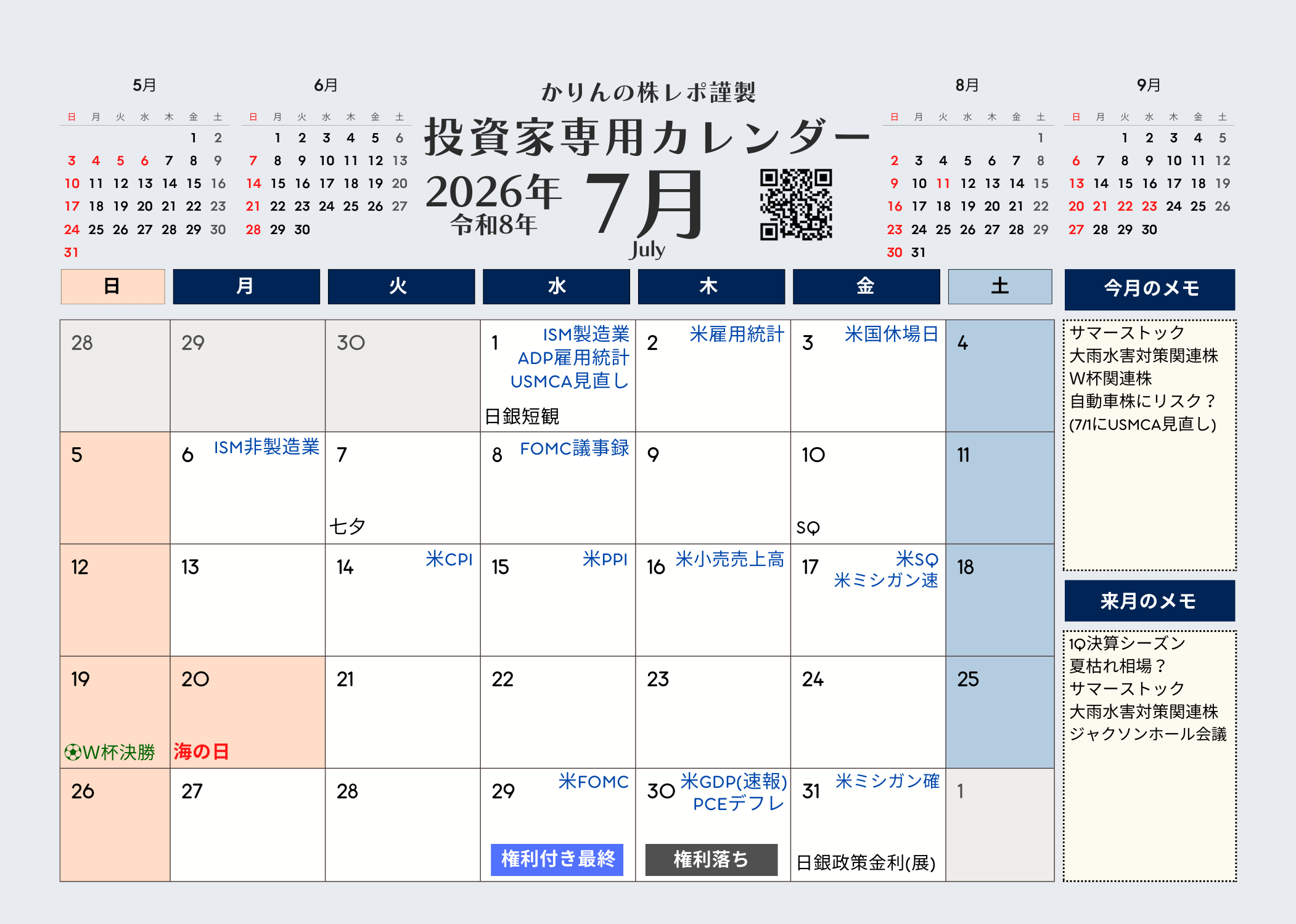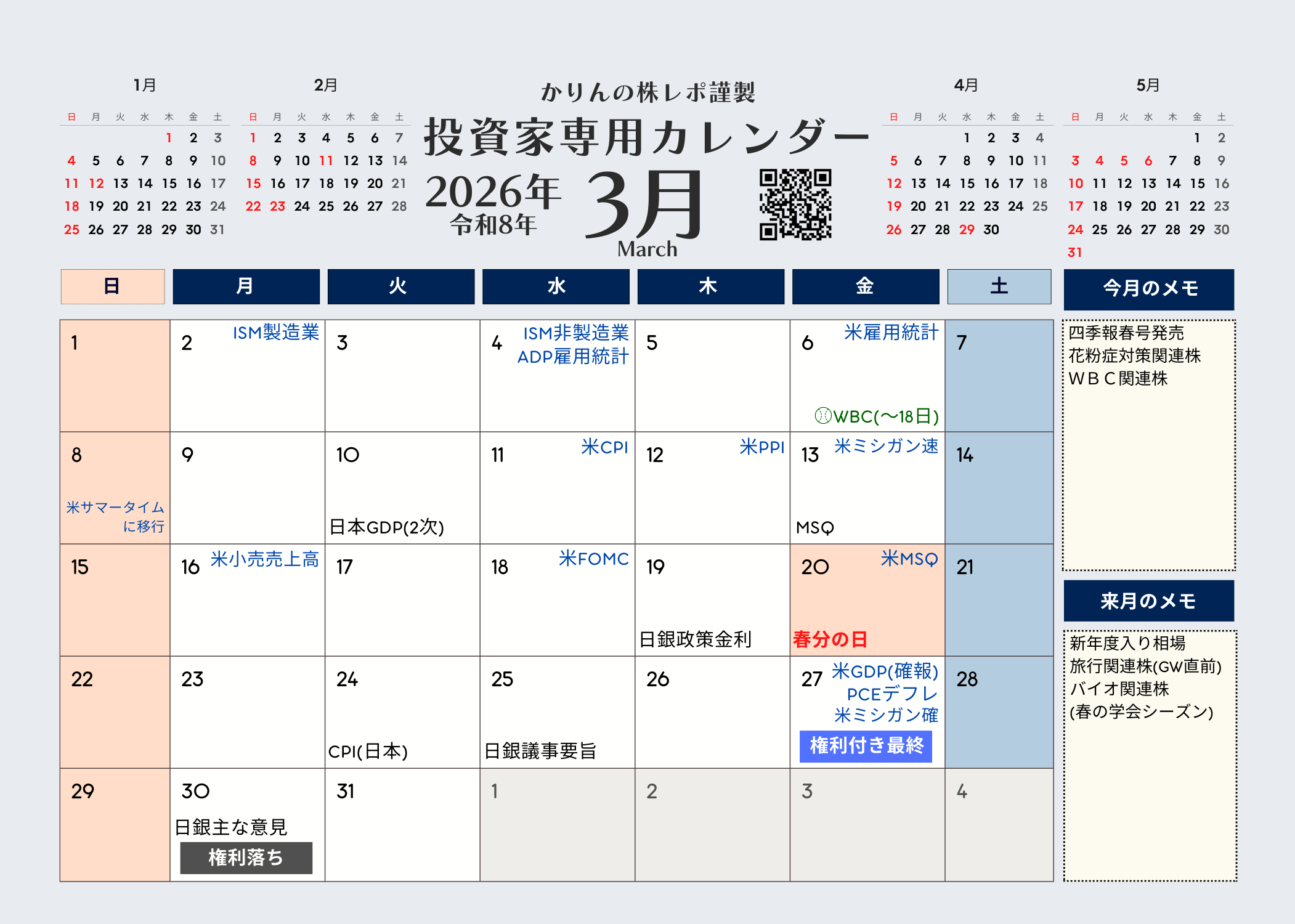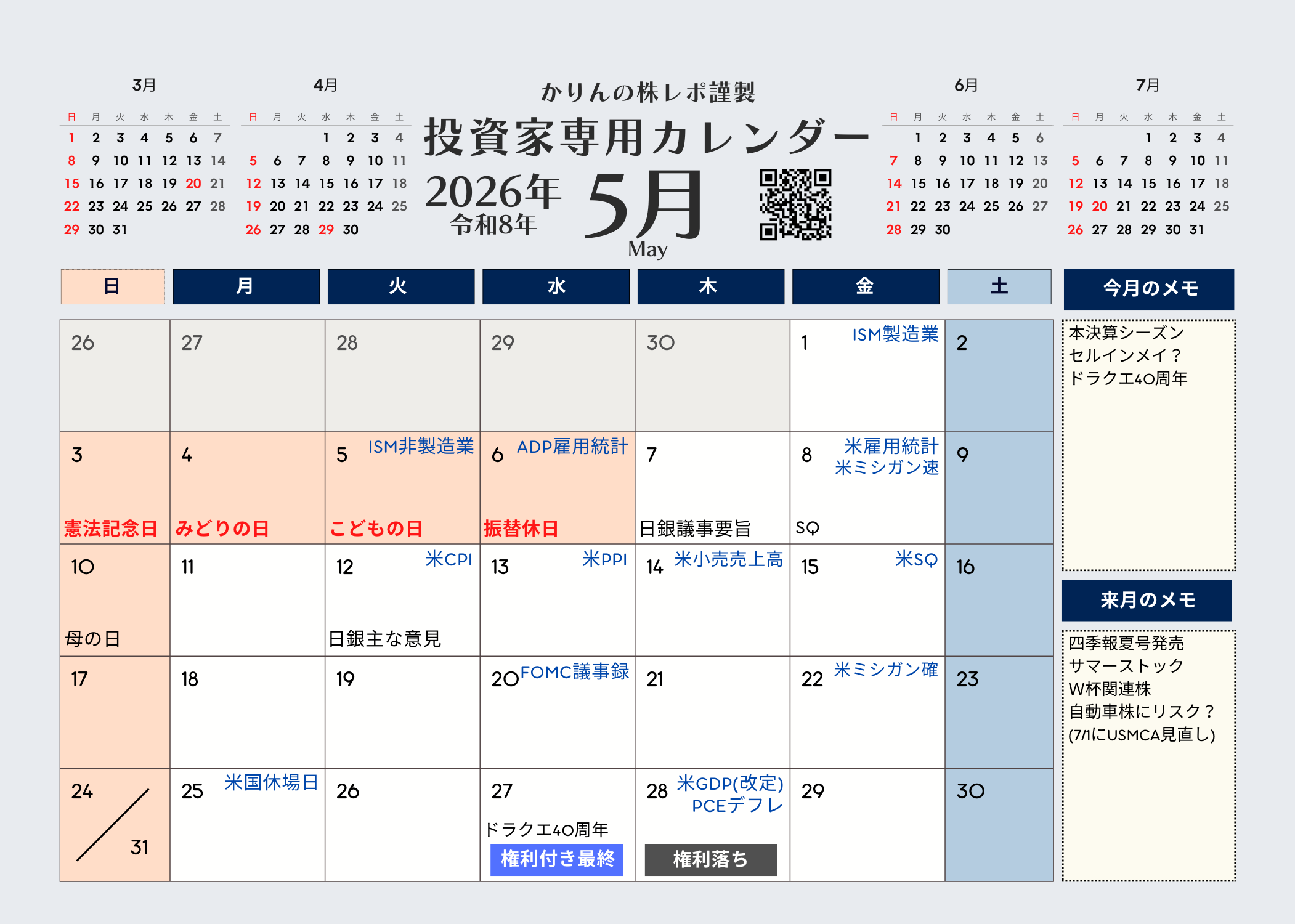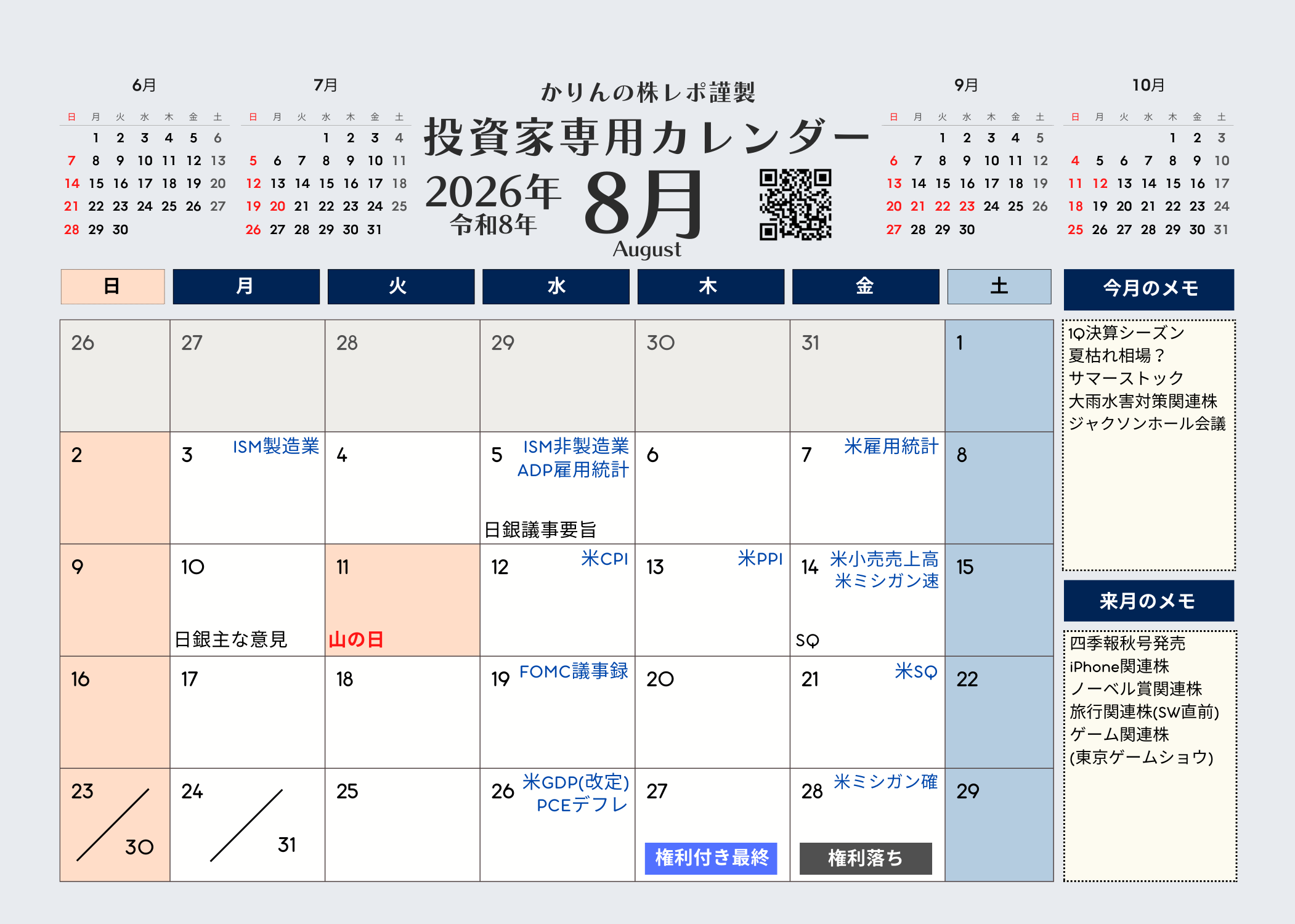 かりんの株レポ謹製 投資家専用カレンダー2026年版版(令和8年)