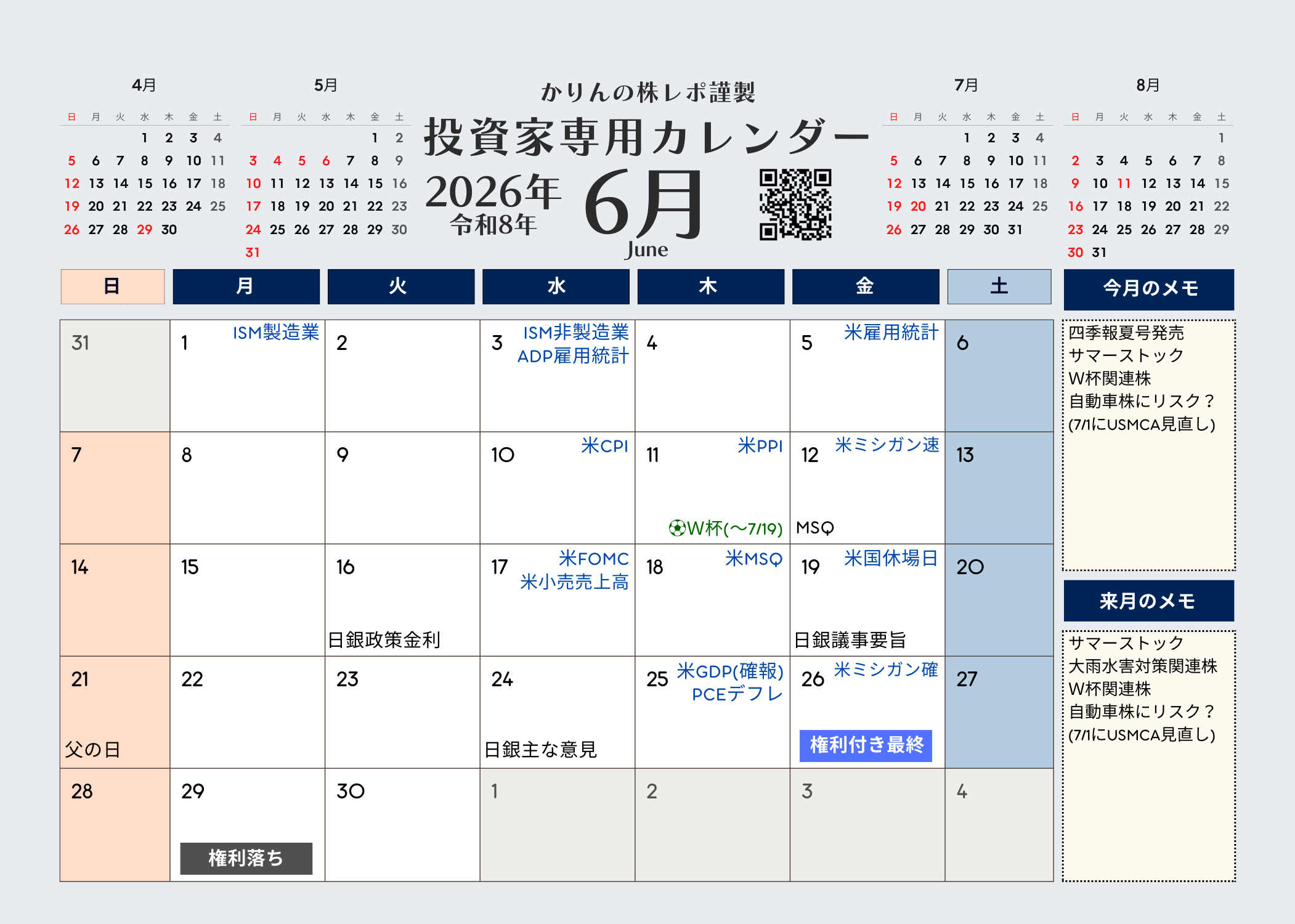 ではさっそくですがかりんの株レポ謹製の投資家専用カレンダー画像をあげておきます。